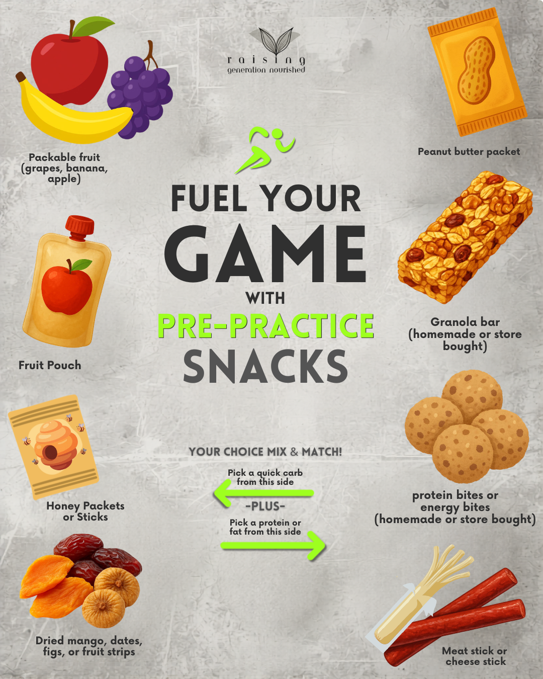 Fueling for after school practice begins…with breakfast. And school lunch for that matter. Shoving a bunch of food down on the way to practice doesn’t do them any good. Ensure they get all 3 macros at breakfast and lunch with substantial meals, and all they will need is a quick snack boost before practice. To see more how I plan these kind of days out, check out one of my 2 week “what we actually ate” meal plans, and you’ll see how I fuel the girls for breakfast and lunch to make it count – especially on practice or game days.